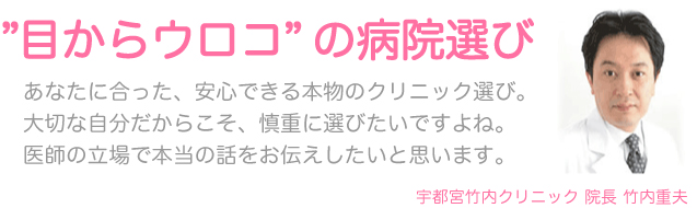 その後3番目に来院されたのが当院、竹内クリニックでした。二重まぶたのカウンセリングが終わった後で私は患者様から怯える様な目で、費用はいくらですかと聞かれたのが印象的でした。「永久保証で8万円ですよと言った瞬間、「そんな安い費用で本当によろしいのでしょうか?」と嬉しそうに言われ、患者様に感激されました。