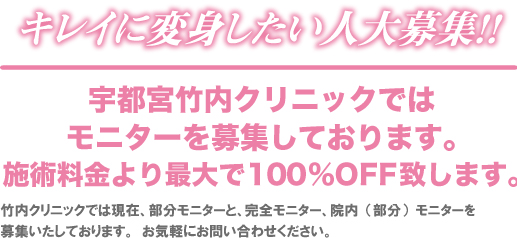 ご来院いただき、院長の診察による審査の結果、部分モニター採用をその場で決定いたします。施術の種類によっては当日施術も可能です。 診察、カウンセリングはすべて無料です。