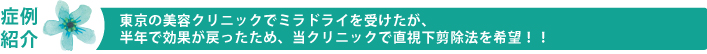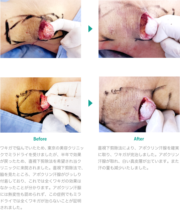 ワキガが気になり、東京の美容クリニックでミラドライを行いましたが、半年くらいで元に戻り、ニオイも汗もほとんど治療効果がなかったため、剪除法を希望され、当クリニックに来院されました。直視下剪除法を行いワキガは完治しました。また同時に汗の量も減少し、快適になりました。手術所見ではアポクリン汗腺が残っており、ミラドライによるアポクリン汗腺の熱変性や何ら作用を及ぼした形跡もなく、健常そのものでした。また真皮深層も熱による瘢痕化形成など、何らかの痕跡すら認められません。これでは患者様が言う通り、ニオイはおろか、汗すらも半年位で戻ったことが解明されました。やはりこの症例においても、ミラドライではワキガの元であるアポクリン汗腺には全く作用していないことが確認されました。