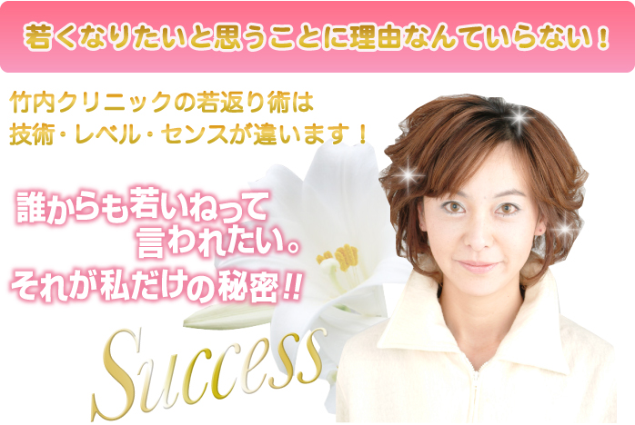 また竹内院長は十仁病院現役時代を含め、今まで若返り術のエキスパートとし て、数千人におよぶフェイスリフトを行ってきました。宇都宮竹内クリニックを開 院した今もその頃の哲学、理念を受け継ぎ、磨き、さらにその技術を極限にまで進 化させ、竹内式ダブルスマッス法を開発いたしました。おかげさまで日本ばかりで なく海外からも若返り施術を受けにたくさんの患者様が竹内クリニックに来院さ れています。