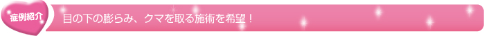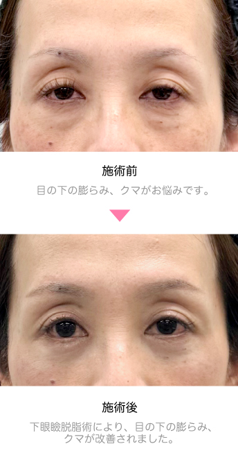 目の下のタルミ、クマがお悩みで当クリニックに来院されました。下眼瞼脱脂術により、まぶたの裏側より脂肪を除去しました。下まぶたの膨らみが取れて、目元のクマ、タルミが改善されました。