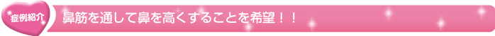 鼻孔の中を小切開して、プロテーゼを挿入する方法です。 手術時間は10分位です。 価格:20万円~25万円(税抜) 表示価格は通常価格です。モニターにご協力いただける方は特別価格にてご案内いたします。