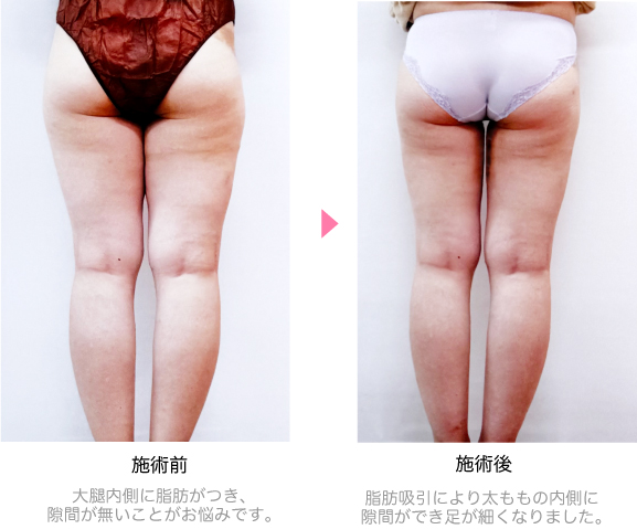 太ももの内側に脂肪がついていることがお悩みで、何をしても痩せなかったため脂肪吸引を希望され当クリニックに来院されました。大腿内側の脂肪吸引を行ない、大腿内側がスッキリと細くなりました。