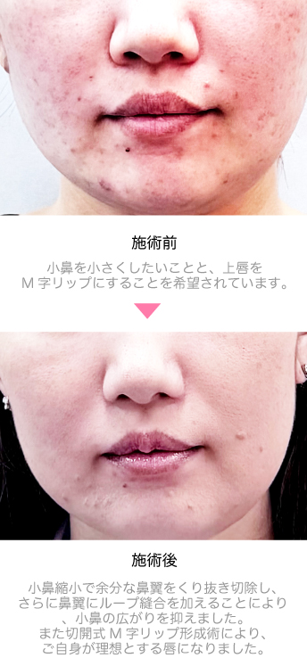 小鼻の広がりと平坦な上唇がお悩みで、永久的で、自然な感じのM字リップと小鼻縮小術を希望され、当クリニックに来院されました。M字リップ形成手術と小鼻縮小(小鼻くりぬき切開+ループ式)を行い、ご自身が希望される形の鼻と自然な感じのM字リップ になりました。