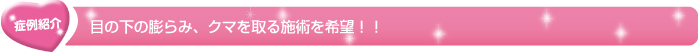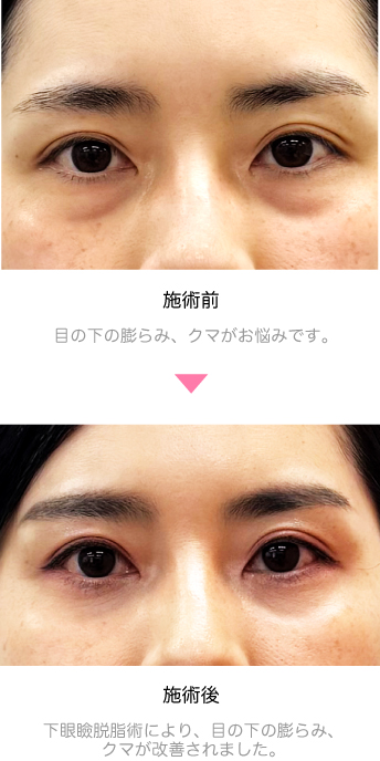 目の下のタルミ、クマがお悩みで当クリニックに来院されました。下眼瞼脱脂術により、まぶたの裏側より脂肪を除去しました。下まぶたの膨らみが取れて、目元のクマ、タルミが改善されました。
