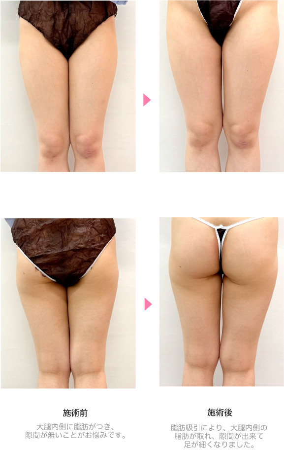 太ももの内側に脂肪がついていることがお悩みで、何をしても痩せなかったため、脂肪吸引を希望され当クリニックに来院されました。大腿内側の脂肪吸引を行い、大腿内側がスッキリと細くなりました。