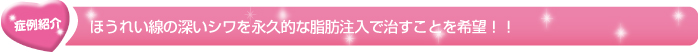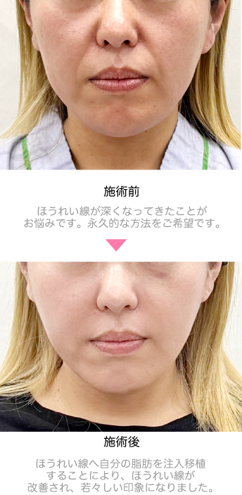 ほうれい線が深くなったことがお悩みで、永久的な方法を希望され当クリニックに来院されました。大腿部より脂肪を採取し、ほうれい線(鼻唇溝)に対して脂肪注入を行いました。自分の脂肪を注入することによりほうれい線のシワが薄くなりました。