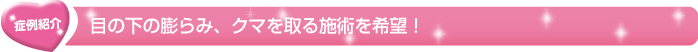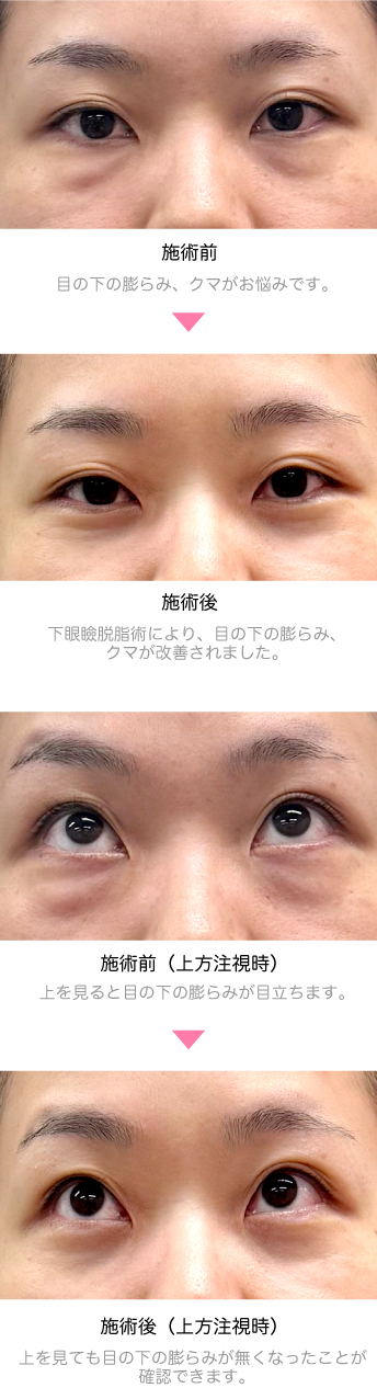 目の下の膨らみ、クマがお悩みで当クリニックに来院されました。下眼瞼脱脂術により、まぶたの裏側より脂肪を除去しました。下まぶたの膨らみが取れて、目元のクマ、タルミが改善されました。