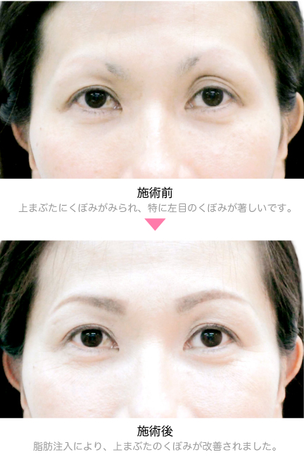 右大腿部より吸引にて脂肪を採取し、上眼瞼脂肪注入を行いました。くぼみは改善され、自然な仕上がりになりました。