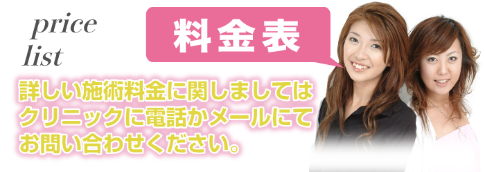 2018年の医療法改正により、キャンペーン価格をホームページに表記することが出来なくなりました。詳しい施術料金をお知りになりたい方は、当クリニックまでメールか電話にてお問い合わせください。詳しく丁寧にご説明いたします。大変ご不便をおかけして申し訳ありませんがよろしくお願いいたします。